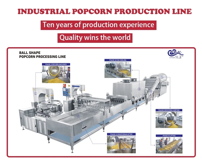We have different length for popcorn production line, like 7 meters, 8 meters,9 meters, 10 meters, 14 meters, and longer.You can according the need to choose the popcorn production line.